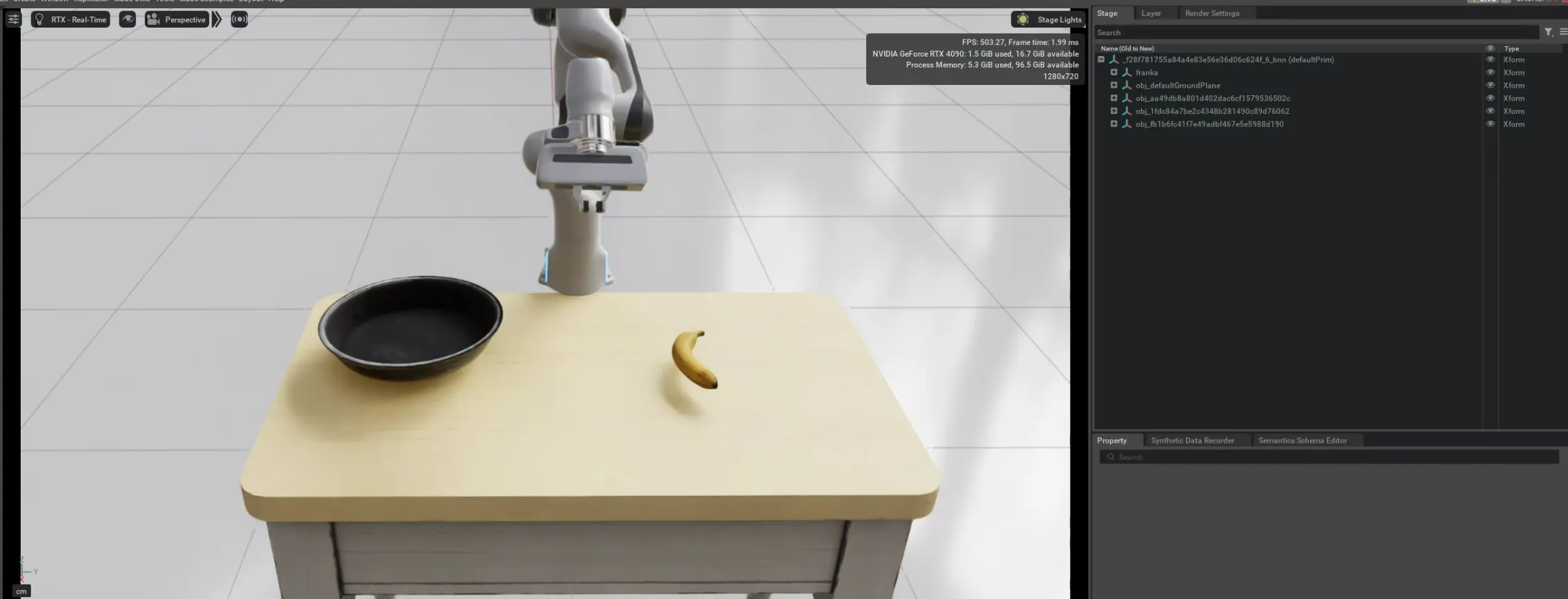 GenManip’s Minimal Config runs in a simple scene called Banana Plate Scene. This scene consists of a table, a banana, a plate, and a Franka robotic arm. The task is to place the banana into the plate.